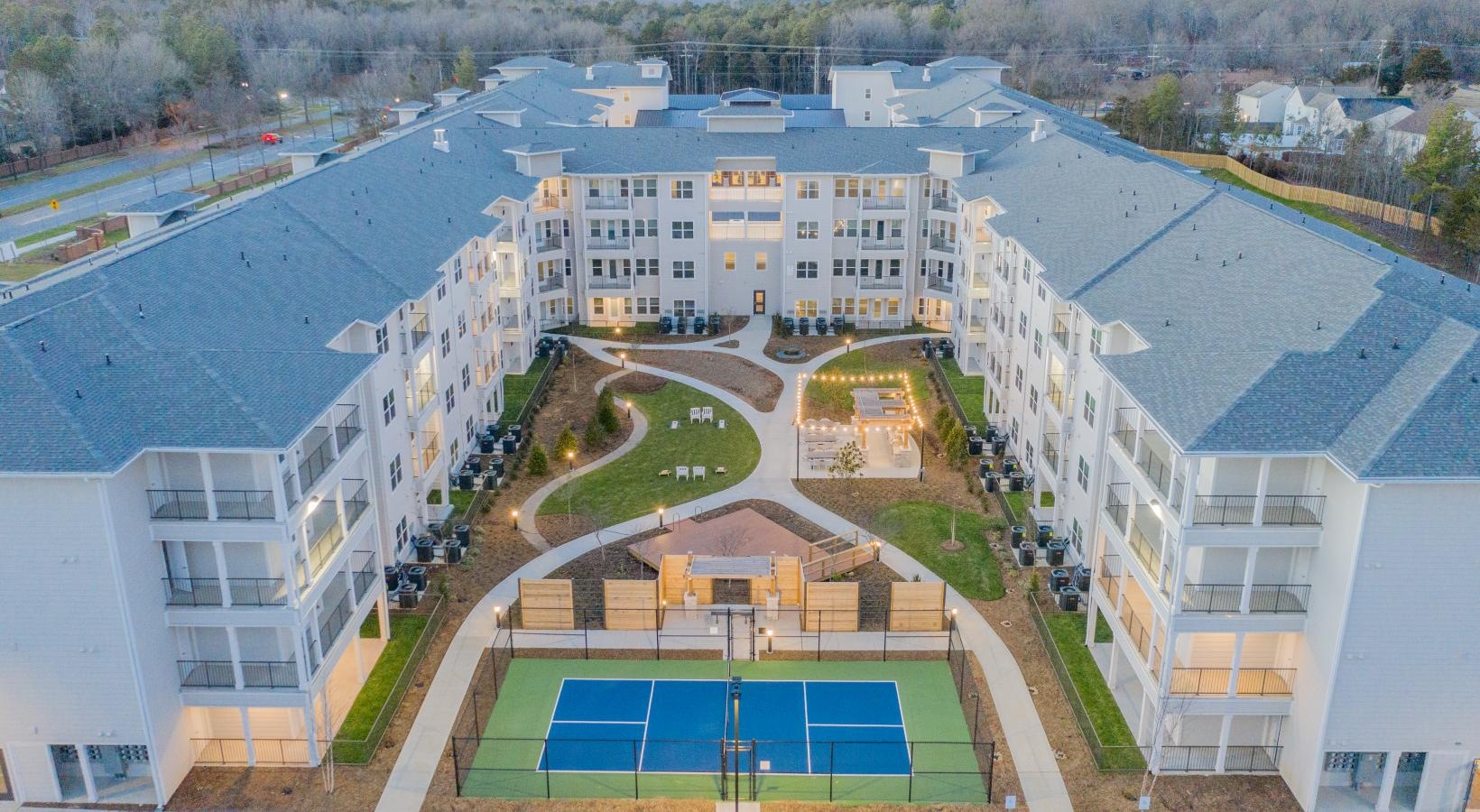 • a high angle view of building and courtyard with pickleball court