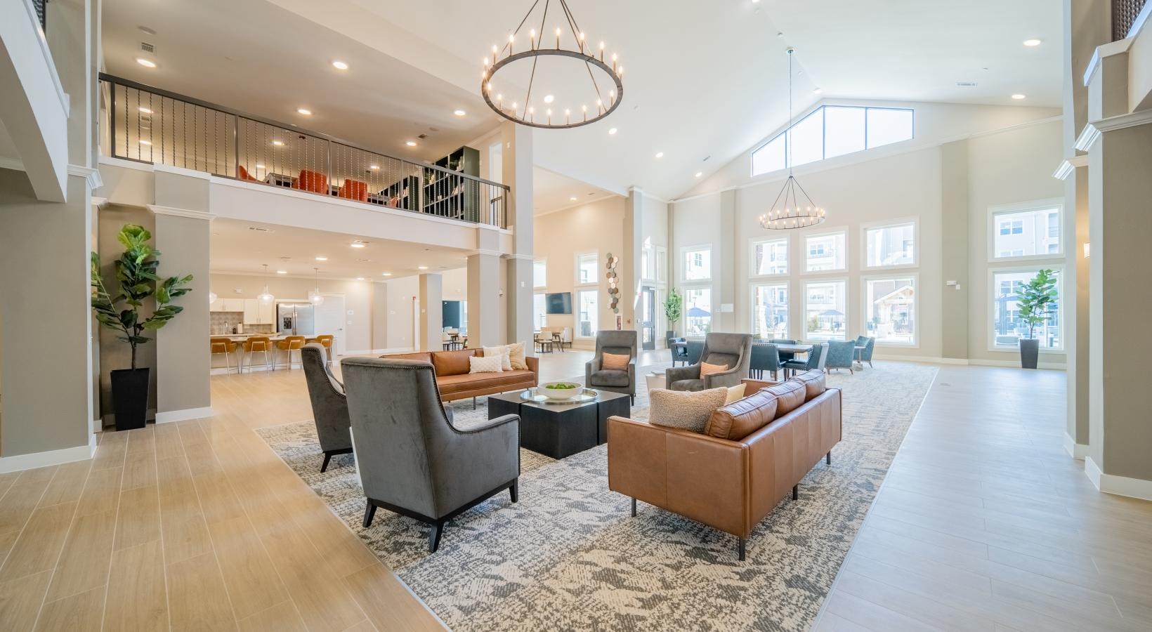 a two-story lounge with seating and tables