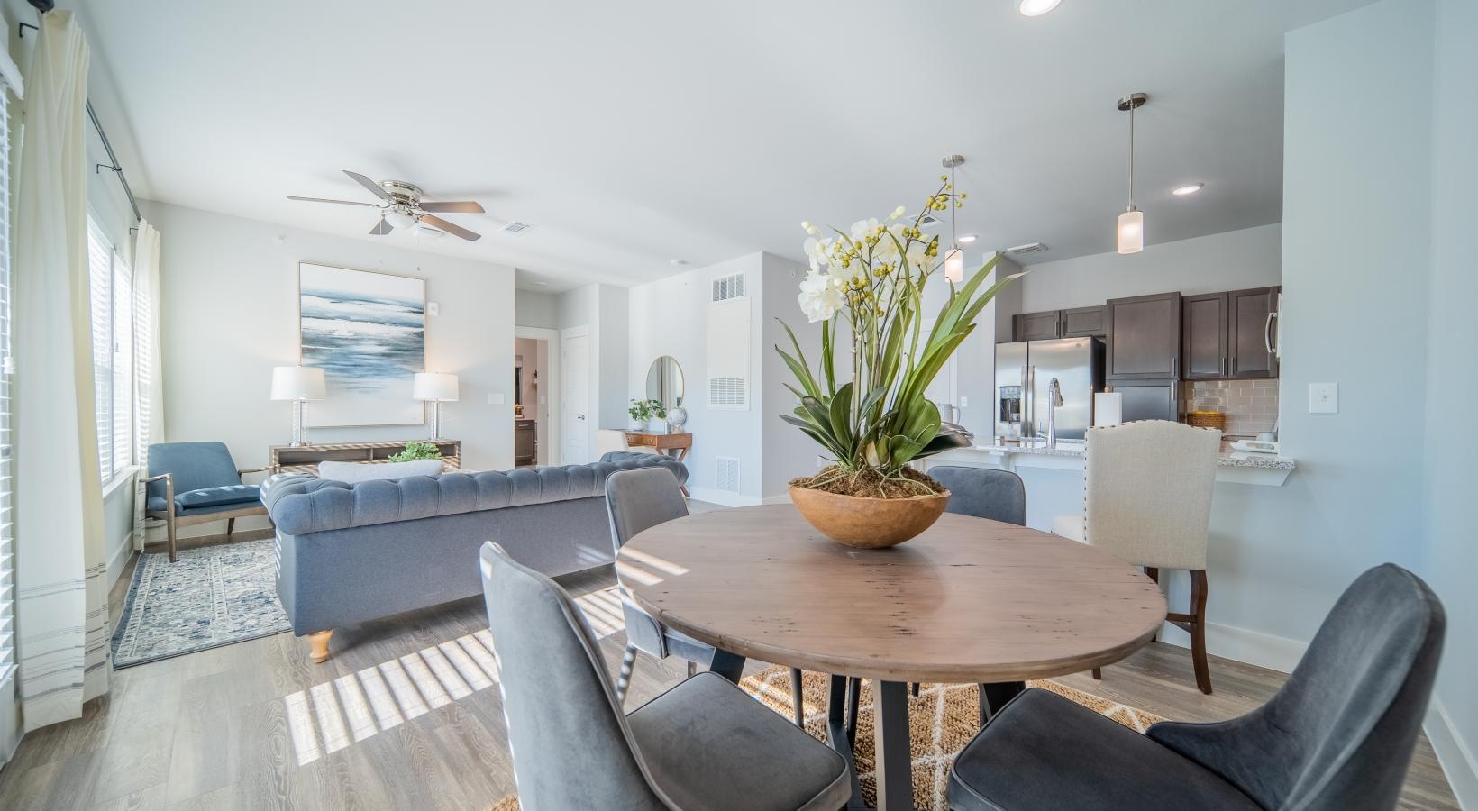 • a living room and dining room table and chairs