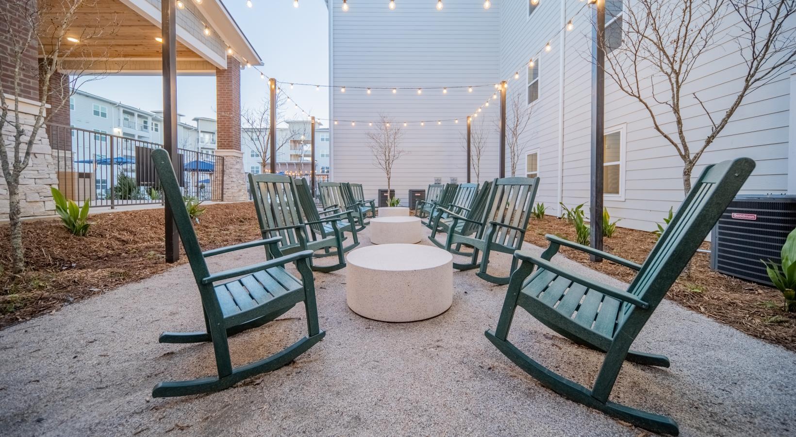 • a group of green rocking chairs outside