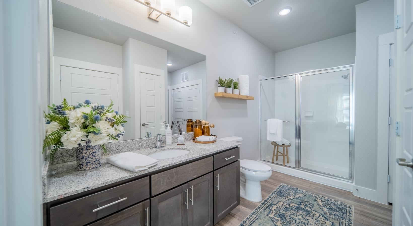 • a bathroom with a marble countertop sink mirror toilet and shower