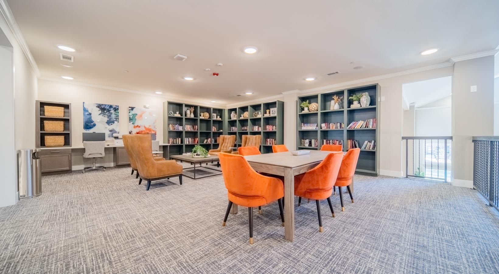 • a room with bookshelves tables and chairs