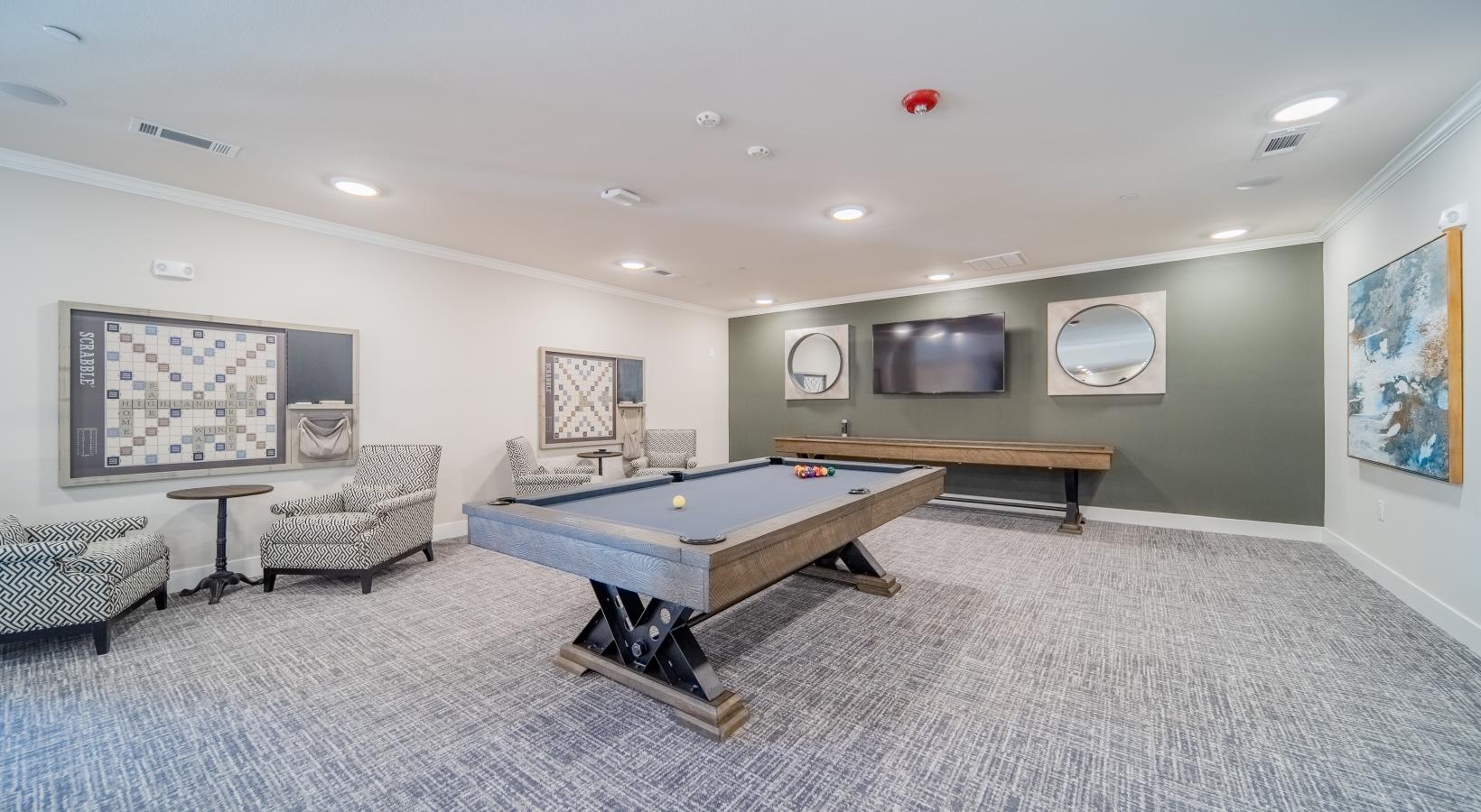 • a room with a tv pool table and chairs