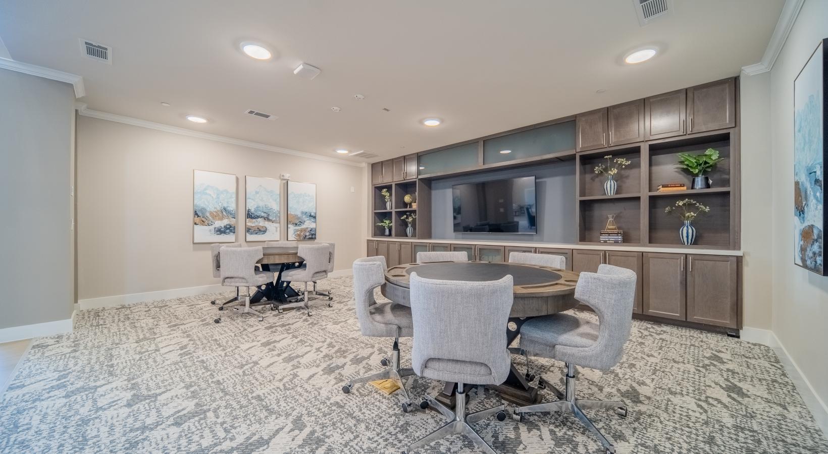 • a room with a table chairs and tv