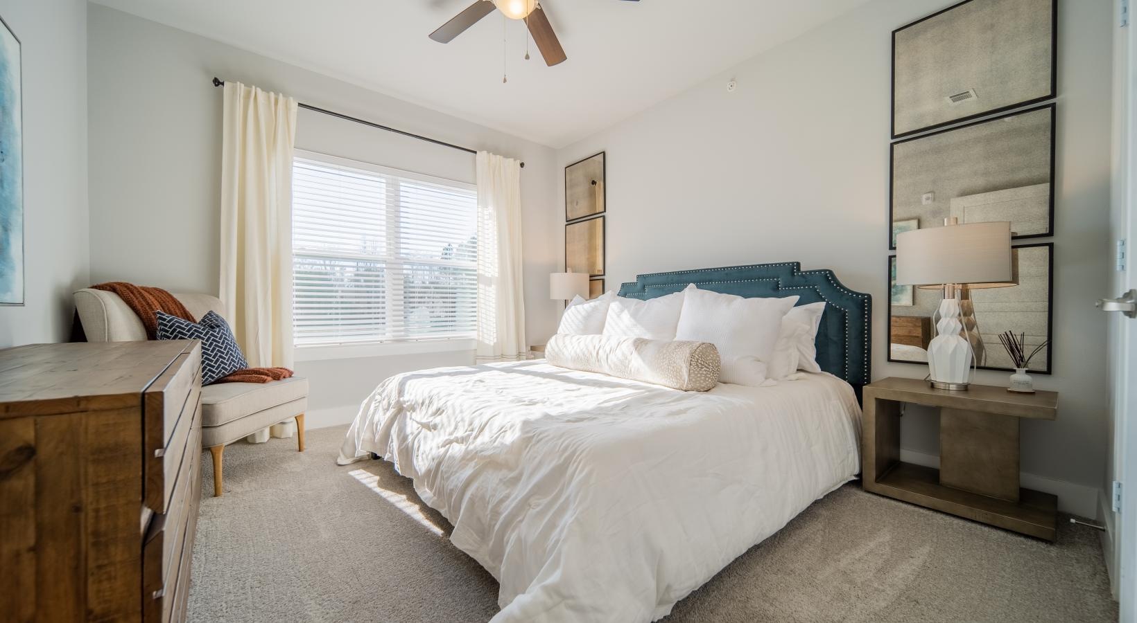 • a bedroom with a bed and a fan
