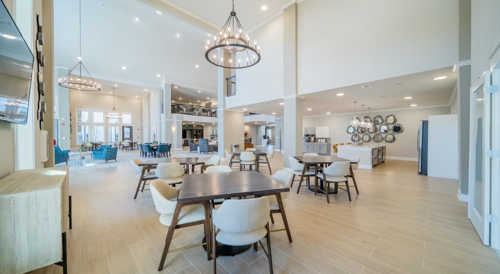 • a large room with tables and chairs
