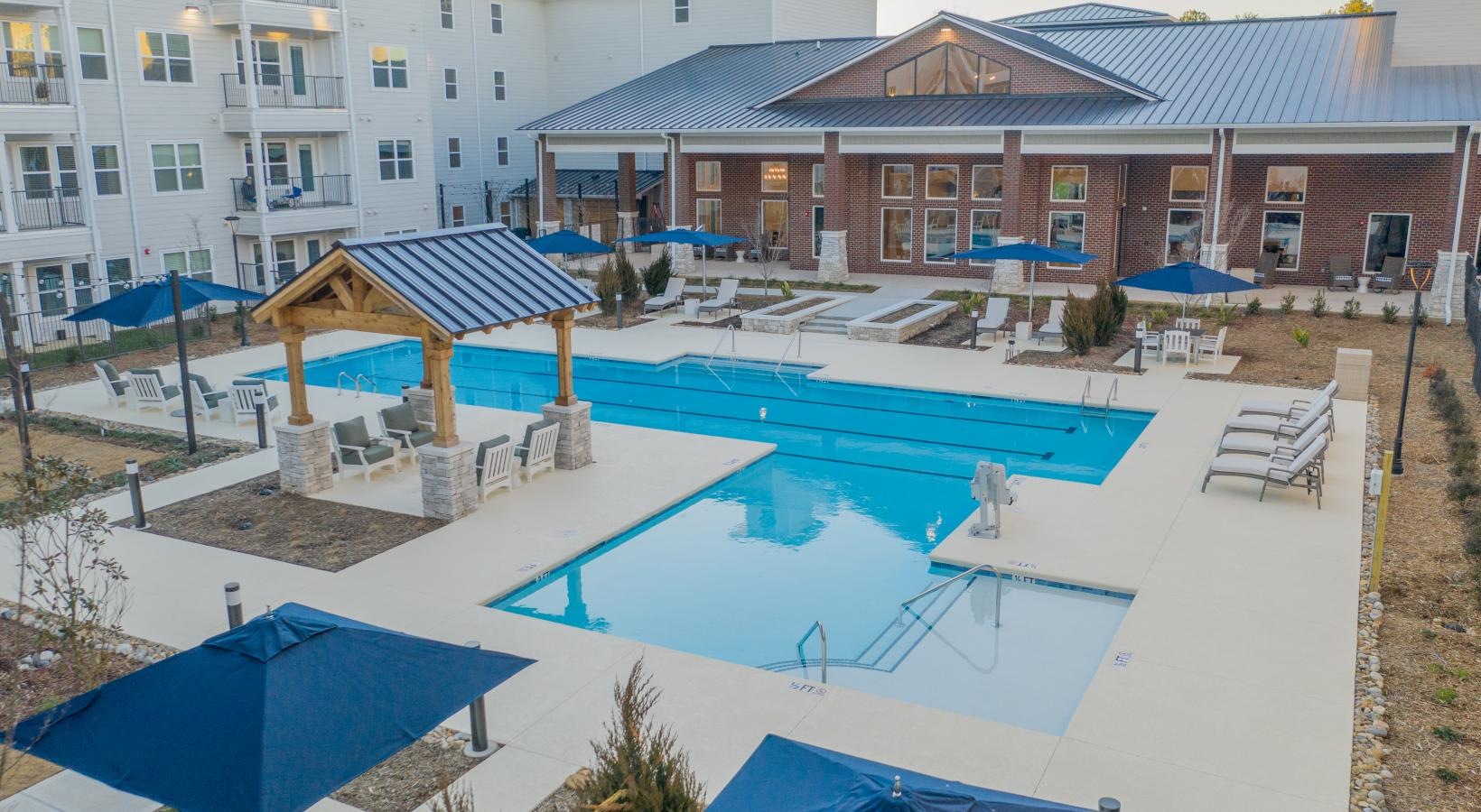 • resort style pool with seating and buildings behind it
